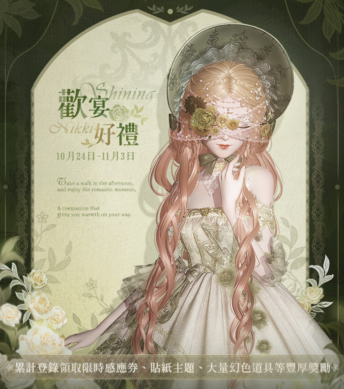 10月24日更新後,【歡宴好禮】累登福利活動開啟!活動期間,首日登錄即可領限時感應道具「盛酒金杯」*10!累計登錄還可獲得貼紙模板「酒神歡宴」和大量幻色材料等超值獎勵~